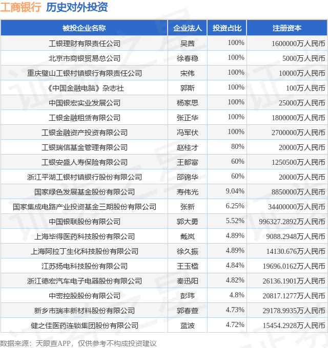 本站消息,根据天眼查APP显示,工商银行(601398.SH)新增一起对外投资事件,被投资公司为许昌开普检测研究院股份有限公司,法定代表人姚致清中财所,投资占比为0.8%。该公司从事商务服务业,注册资本为10400万人民币。目前,工商银行共存在对外投资1097项,投资占比前20的项目见下表: