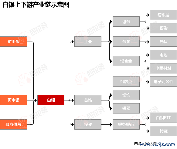 下游方面,白银的实物需求主要由工业用银(电子电器、光伏、摄影和电力电池等)、首饰用银(银器、银饰)以及投资用银(银币银条)组成。其中,工业用银是最大的白银需求构成,工业用银主要分为银浆、镀银、银合金、银触点。银浆系由高纯度的(99.9%)金属银的微粒、粘合剂、溶剂、助剂所组成的一种机械混和物的粘稠状的浆料,一般应用在电阻、电感、电容的陶瓷元件中。镀银则是重要的电子功能性镀层,在印制板、接插件、波导等电子和通信产品中扮演重要角色,也是电铸功能性制品或工艺制品的重要镀种。银触点广泛应用在电子电器的生产,如开关、继电器和导电线路中的交点支点等。工业用银的下游需求主要是光伏、摄影、电子元器件。首饰用银方面,银饰和银器相辅相成。投资用银主要是白银ETF是指一种以实物白银为基础资产,追踪现货白银价格波动的金融衍生产品。